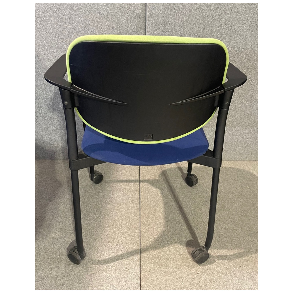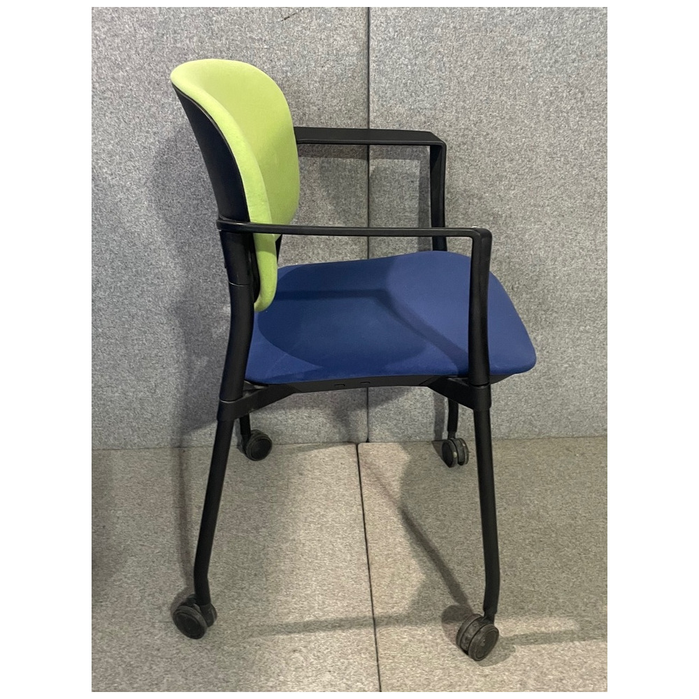 Krzesło konferencyjne na kółkach. Siedzisko w kolorze niebieskim, oparcie żółto-zielone.